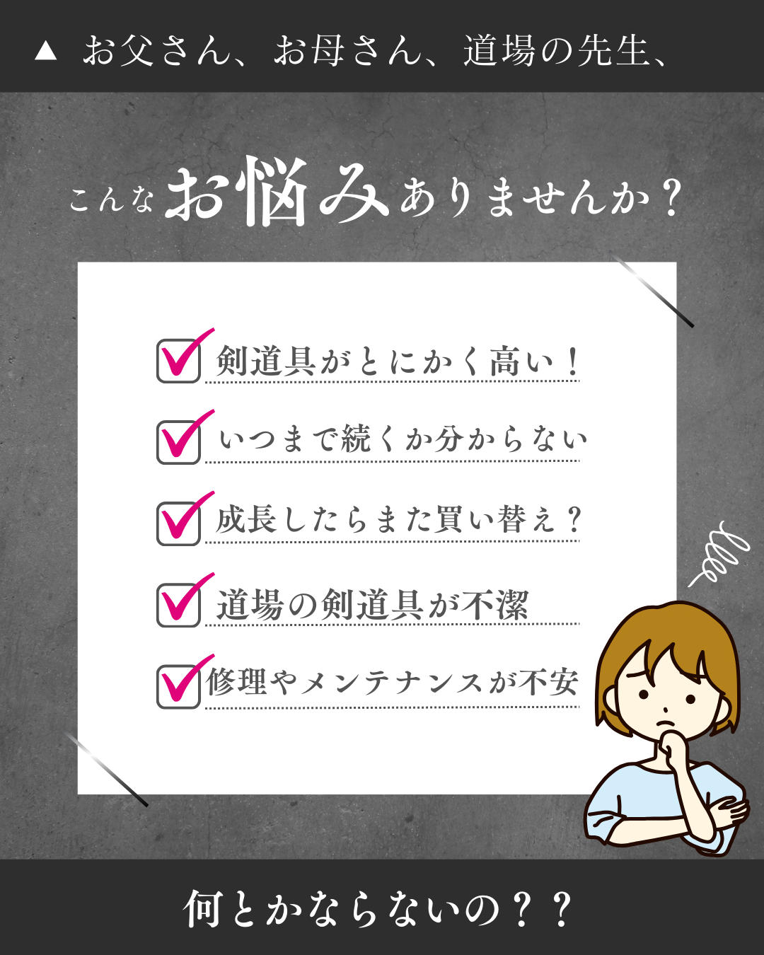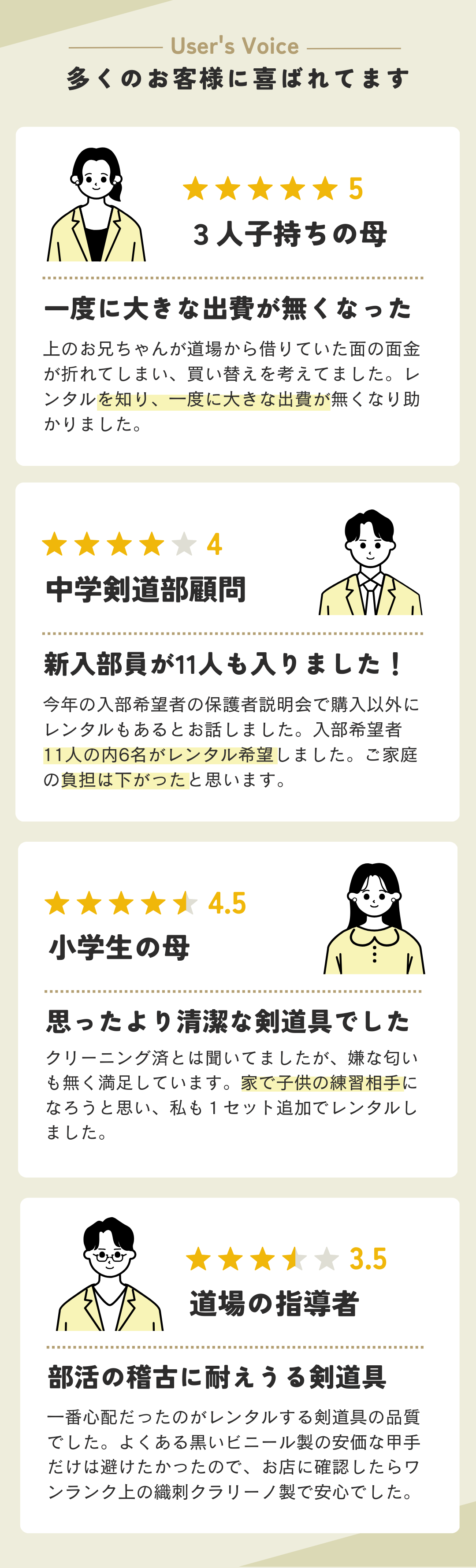 全く問題ありません。剣道具は購入すれば5万円、レンタルなら1,480円。一度に沢山の出費が無くなるので、兄弟の多い方や、いつまで続くか分からないという人、お子さんの打たれ役になって上げたいお母さん、学校や道場など喜ばれています。リユース品でもクリーニング済、清掃済なので嫌な匂いもありません。手入れされているのでむしろ学校や道場から借りる剣道具よりも清潔にお使いいただけます。