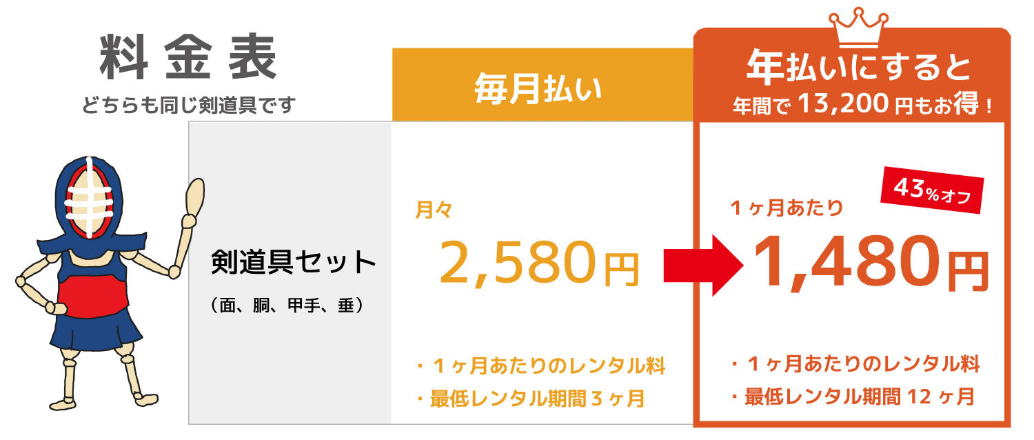 ※割高にはなりますが、最低契約期間4ヶ月の月額プランでご了承いただければ剣道具をご用意させていただくことは可能です。